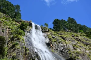 A graceful waterfall cascading through lush tea estates, offering cool mist, scenic beauty, and tranquil hill-country charm.