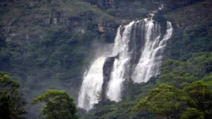 A stunning multi-stream waterfall near Nuwara Eliya, famed for wide cascades, cool climate, and lush highland scenery.