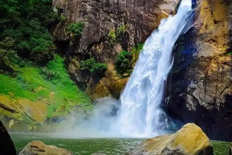 A majestic tiered waterfall in Nuwara Eliya, admired for its powerful cascades, cool mist, and breathtaking highland scenery.