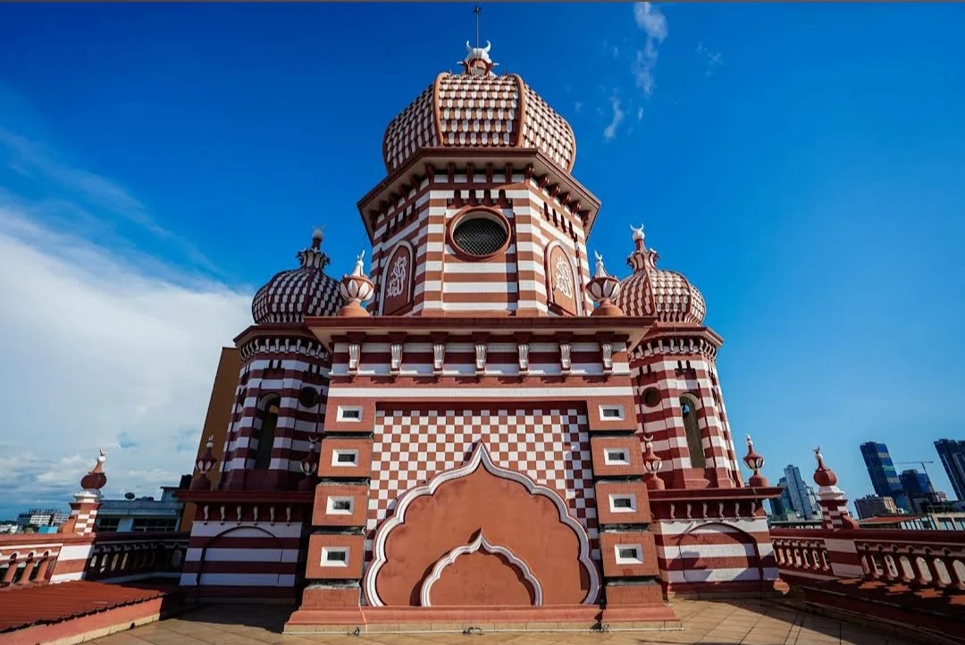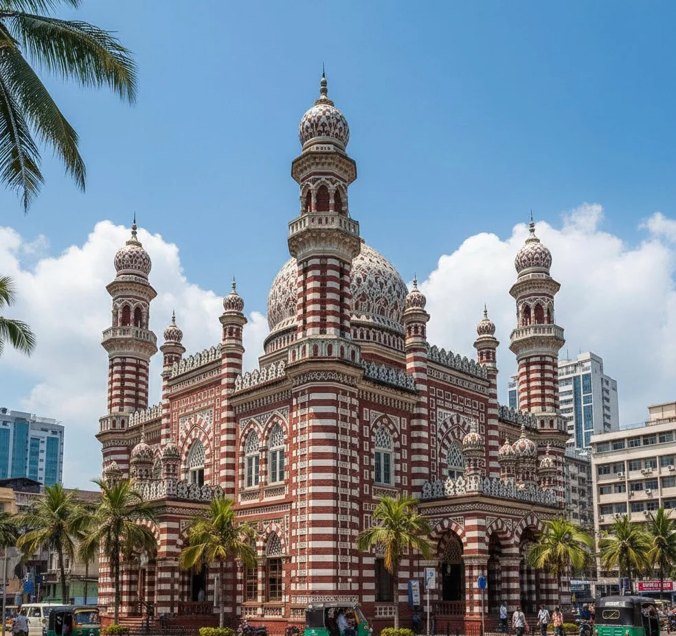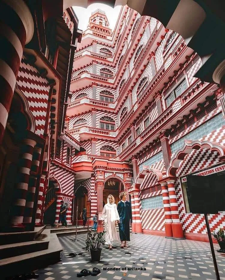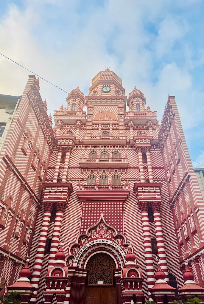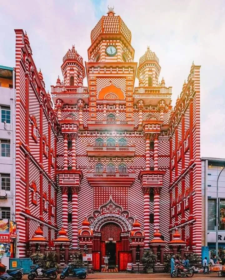 The Jami Ul-Alfar Mosque is one of the most famous and beautiful buildings in Colombo, Sri Lanka. Most people call it the “Red Mosque” because of its amazing red and white brick patterns. It was built way back in 1908 in a busy area called Pettah. The building is very tall and has many towers. It looks like a giant candy house or a layered cake because of the stripes and swirls on the walls. It is a very important place for people to pray, but it is also a place that tourists love to visit.
