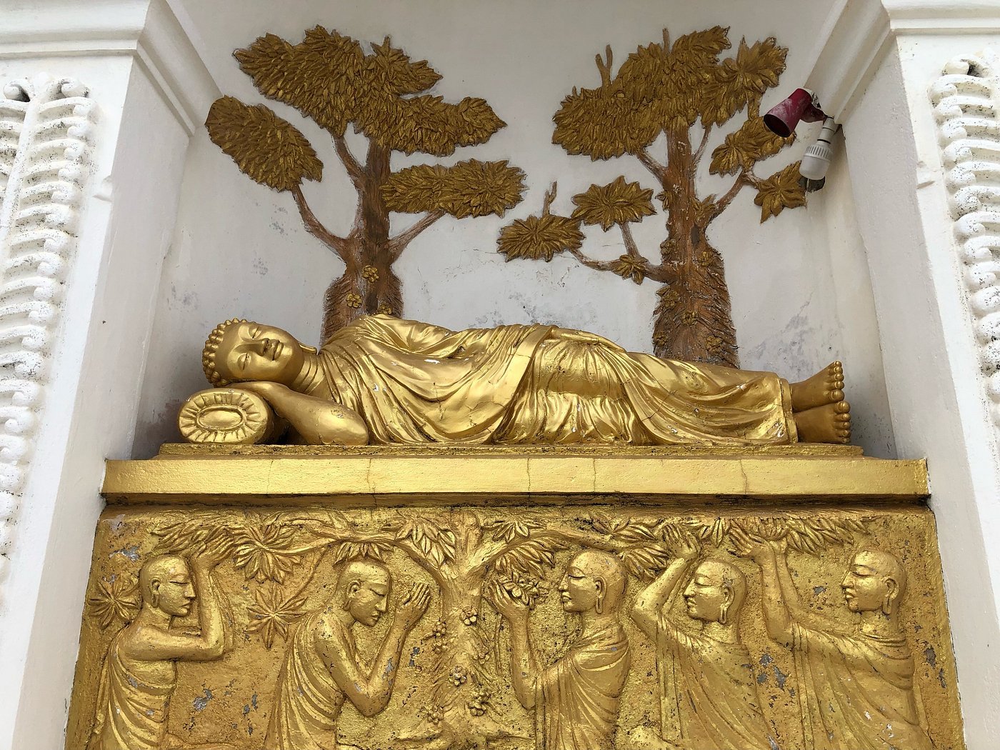 ↔️ මෙහි ඇති රන්වන් පැහැති පිළිම මගින් සිද්ධාර්ථ කුමාරයාගේ උප්පත්තිය, බුද්ධත්වය සහ පිරිණිවන් පෑම වැනි අවස්ථා නිරූපණය වේ.
