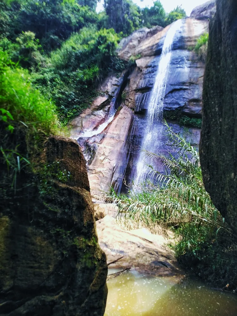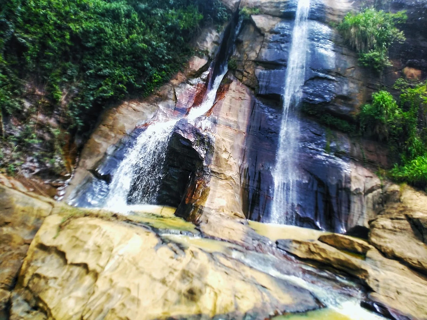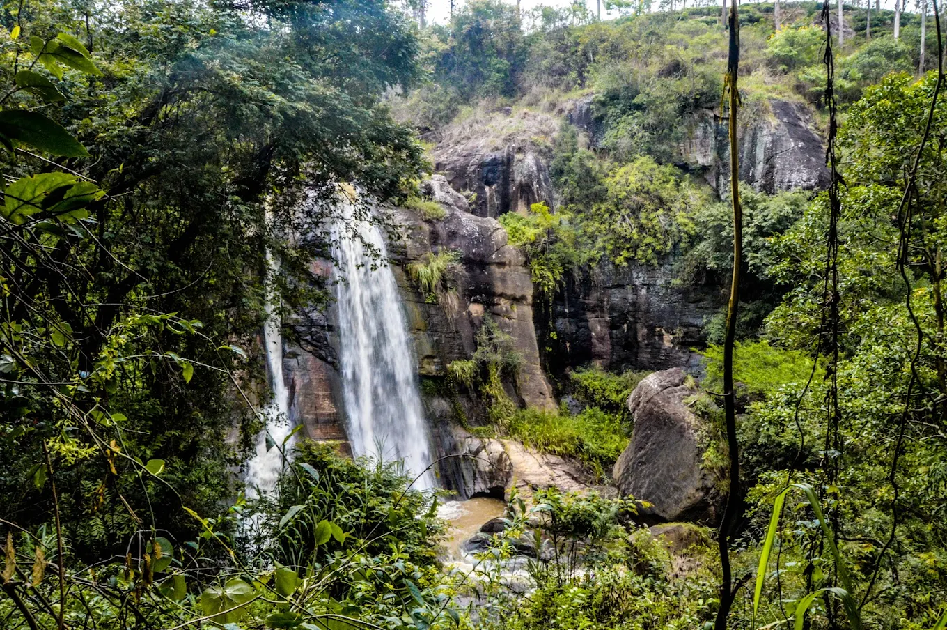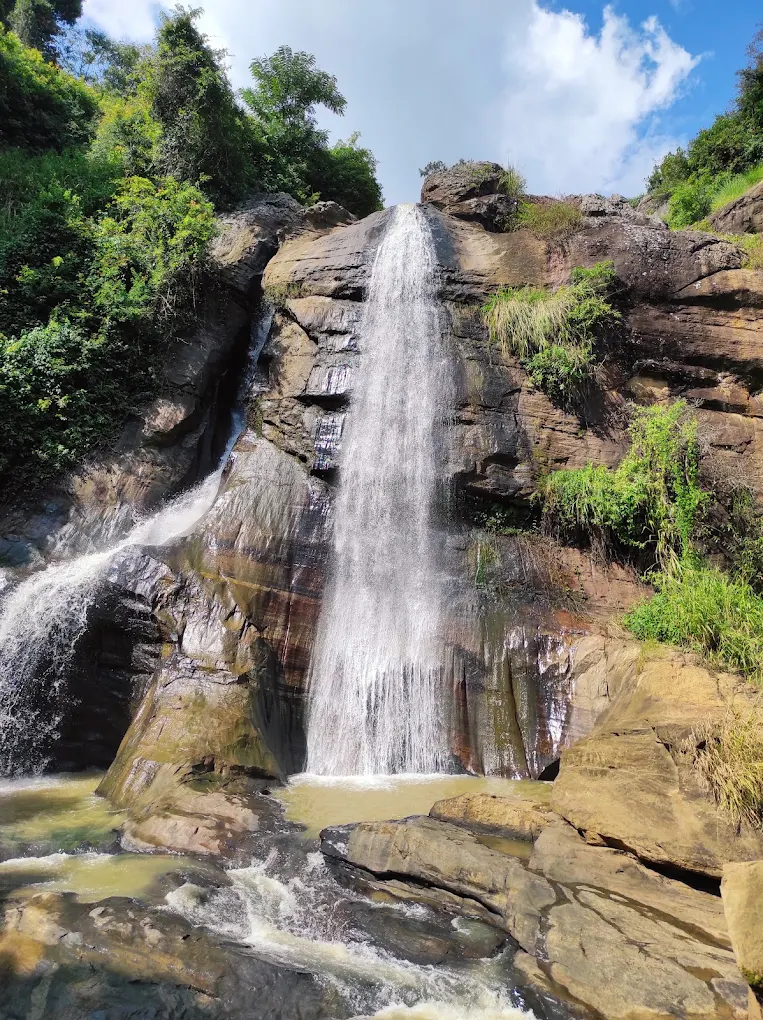 The water starts from seven unique stone basins at the top. As it flows down, it splits into two parts. One side falls straight down, while the other hits a rock and spreads out. This spreading water looks just like the colorful feathers of a dancing peacock! This unique shape makes it one of the most interesting waterfalls to see in the Uva Province.