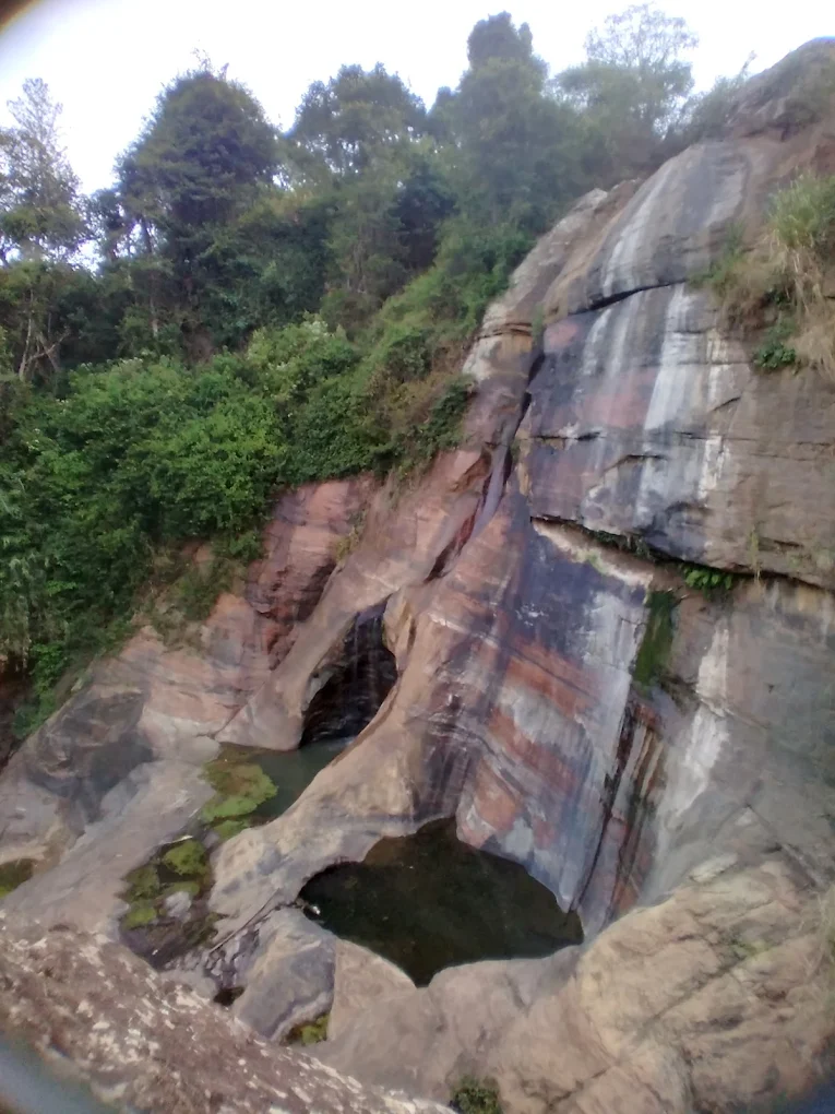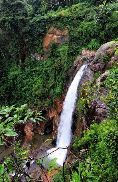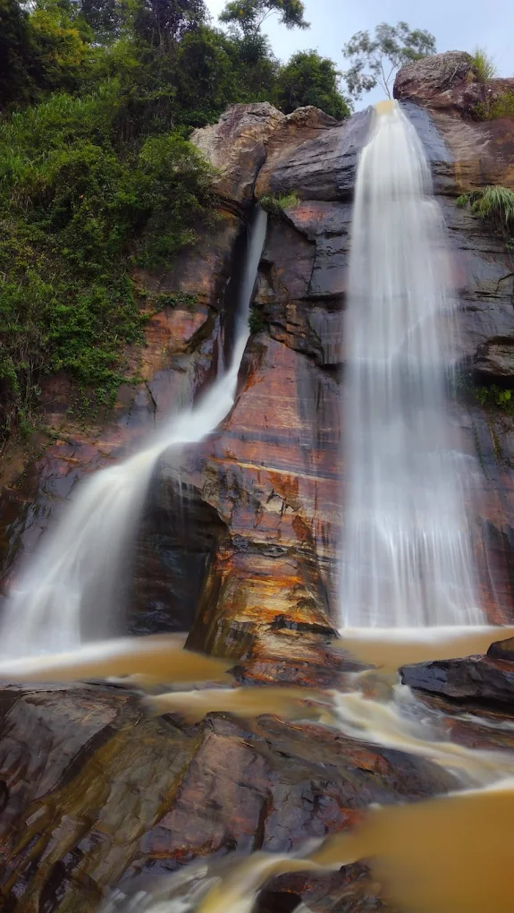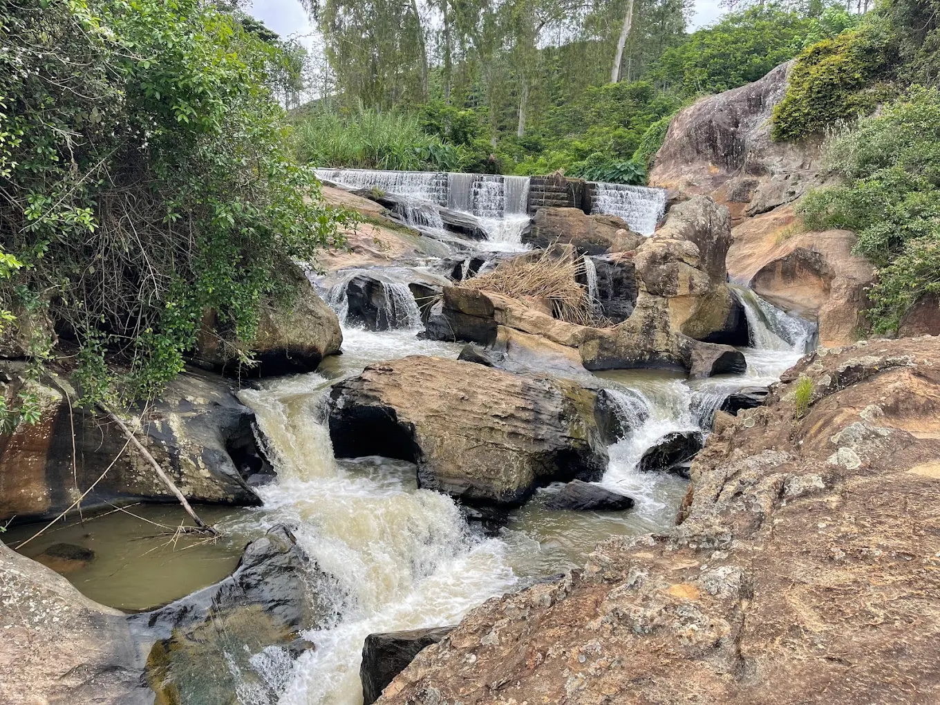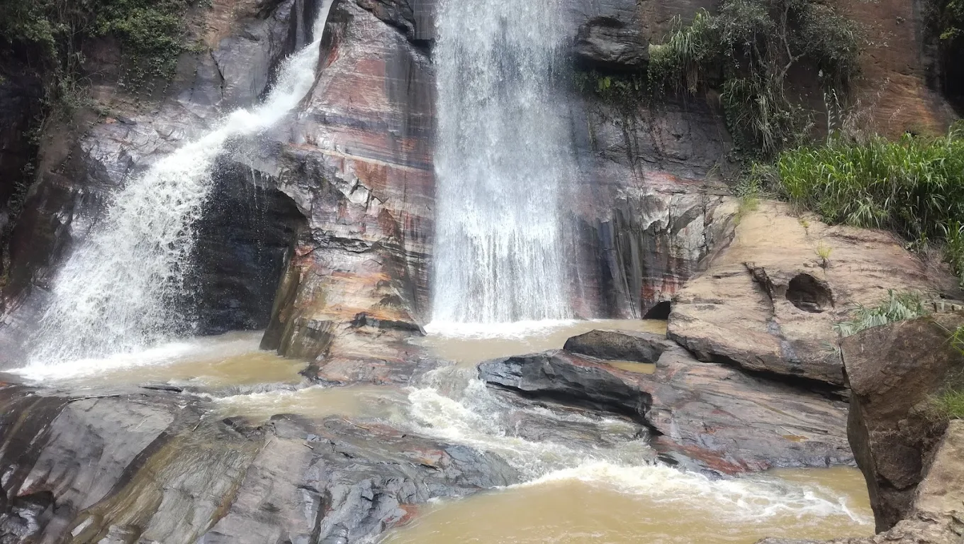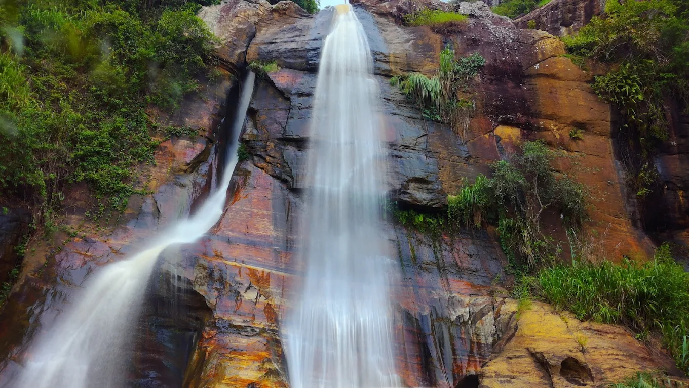 The water starts from seven unique stone basins at the top. As it flows down, it splits into two parts. One side falls straight down, while the other hits a rock and spreads out. This spreading water looks just like the colorful feathers of a dancing peacock! This unique shape makes it one of the most interesting waterfalls to see in the Uva Province.