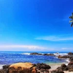 A golden sandy beach with calm waters, palm-lined shores, and a relaxed coastal atmosphere ideal for swimming and leisure.