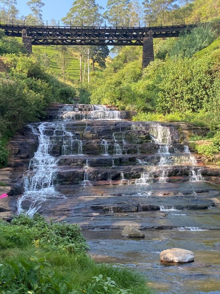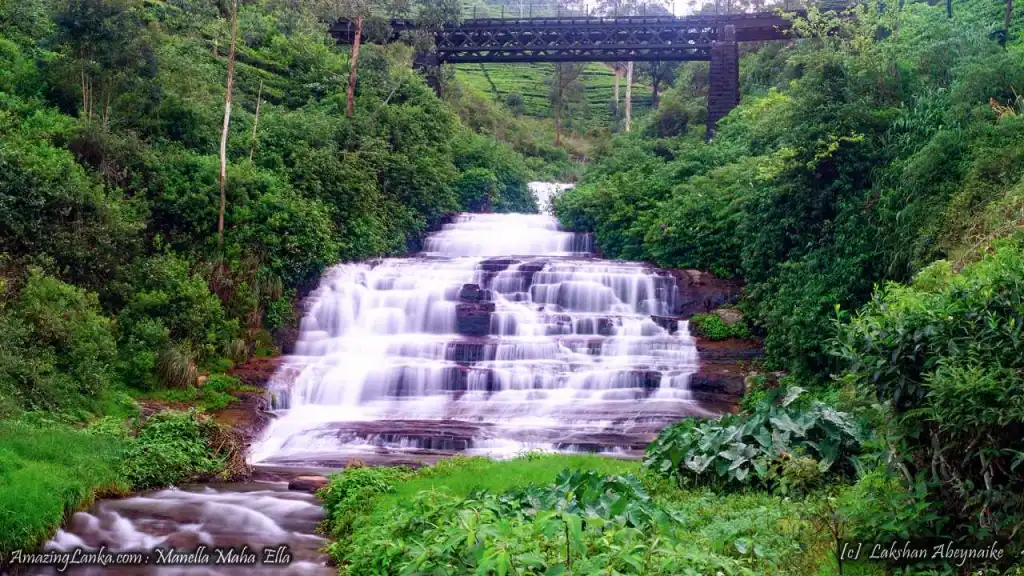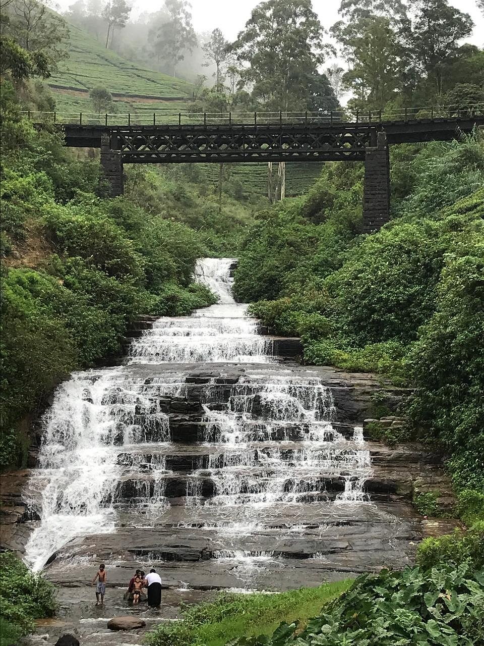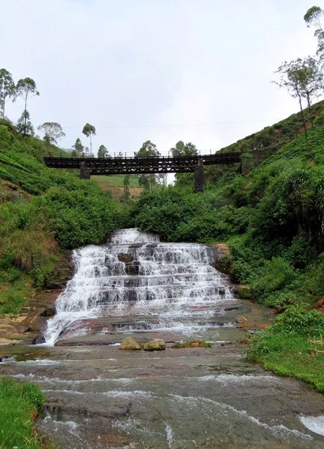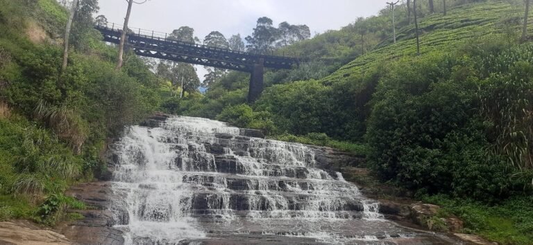 The waterfall starts from the Nanu Oya river, which flows through the green tea estates of Udaradella and Bambarakelle. After tumbling down the rocks, the water eventually joins the larger Kotmale and Mahaweli rivers. One of the most special features of this waterfall is that it is located right near the famous Nanu Oya Railway Station. There is even a railway bridge that goes over the falls, making it a very unique scene where you might see a train passing right above the cascading water!