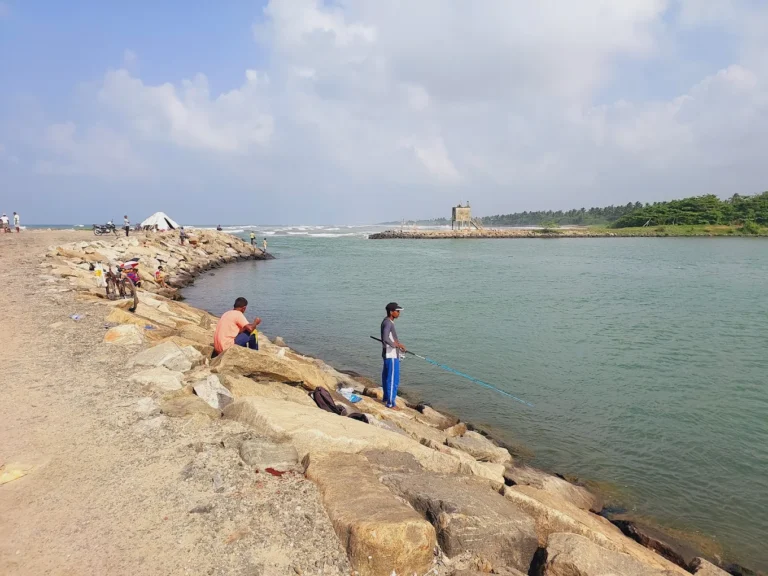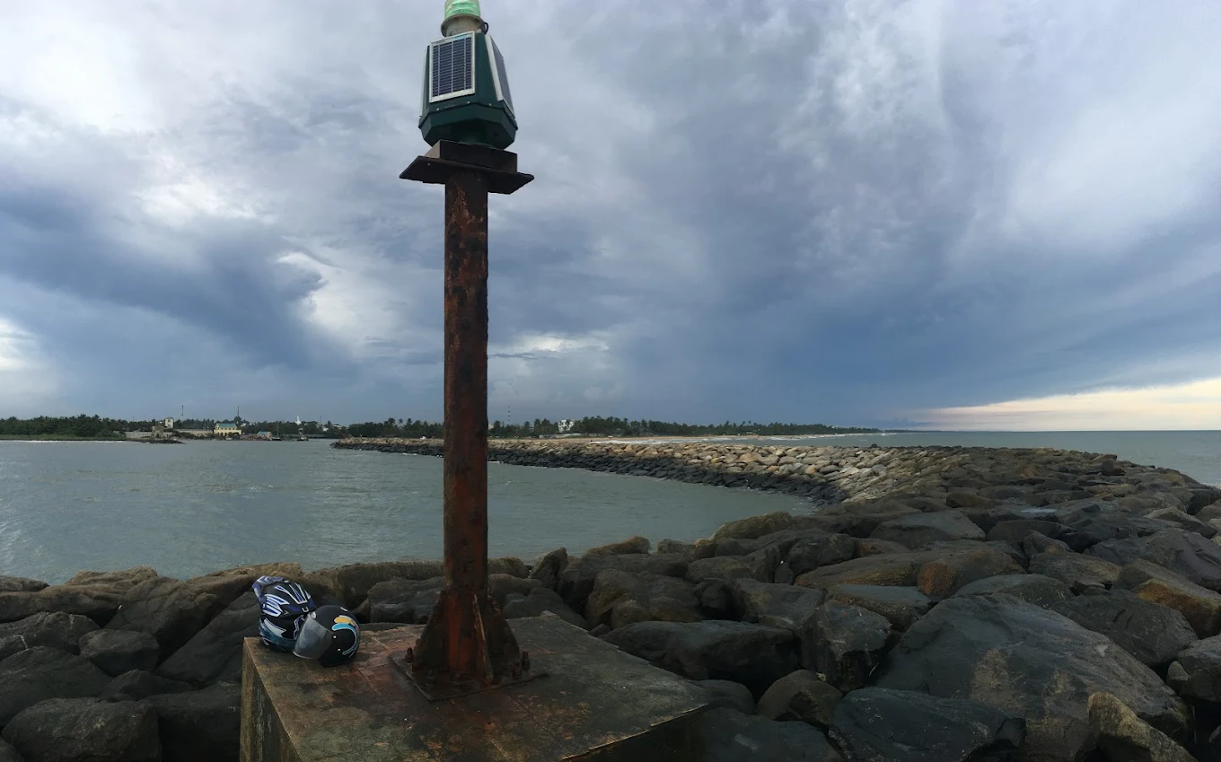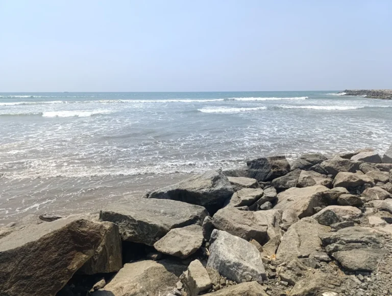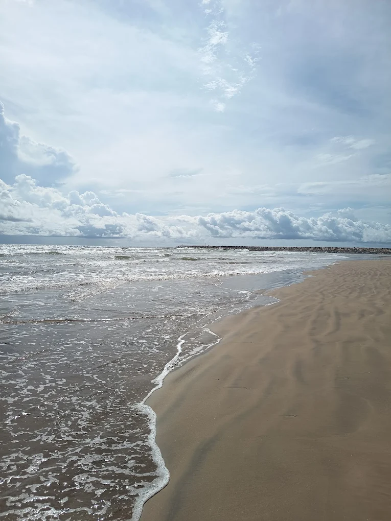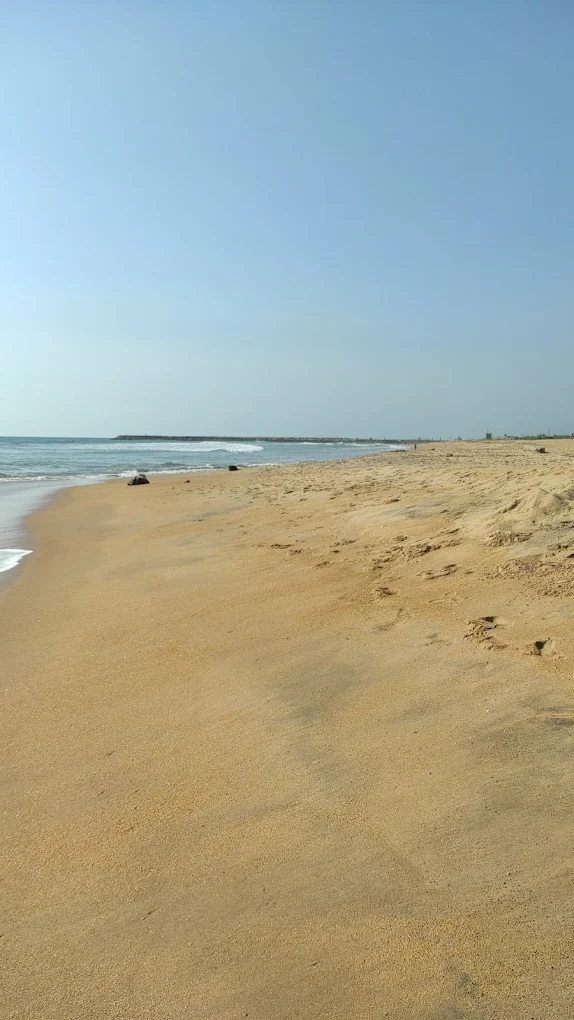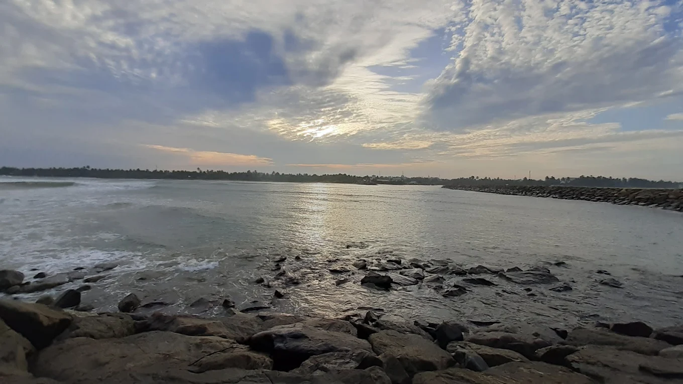 Visiting the breakwater is a very calming experience. You will hear the loud, rhythmic sound of the waves hitting the rocks and see the vast horizon. It feels very open and free. You get to see a mix of nature and local life, with families playing on the sand and the river water mixing with the salty sea.
