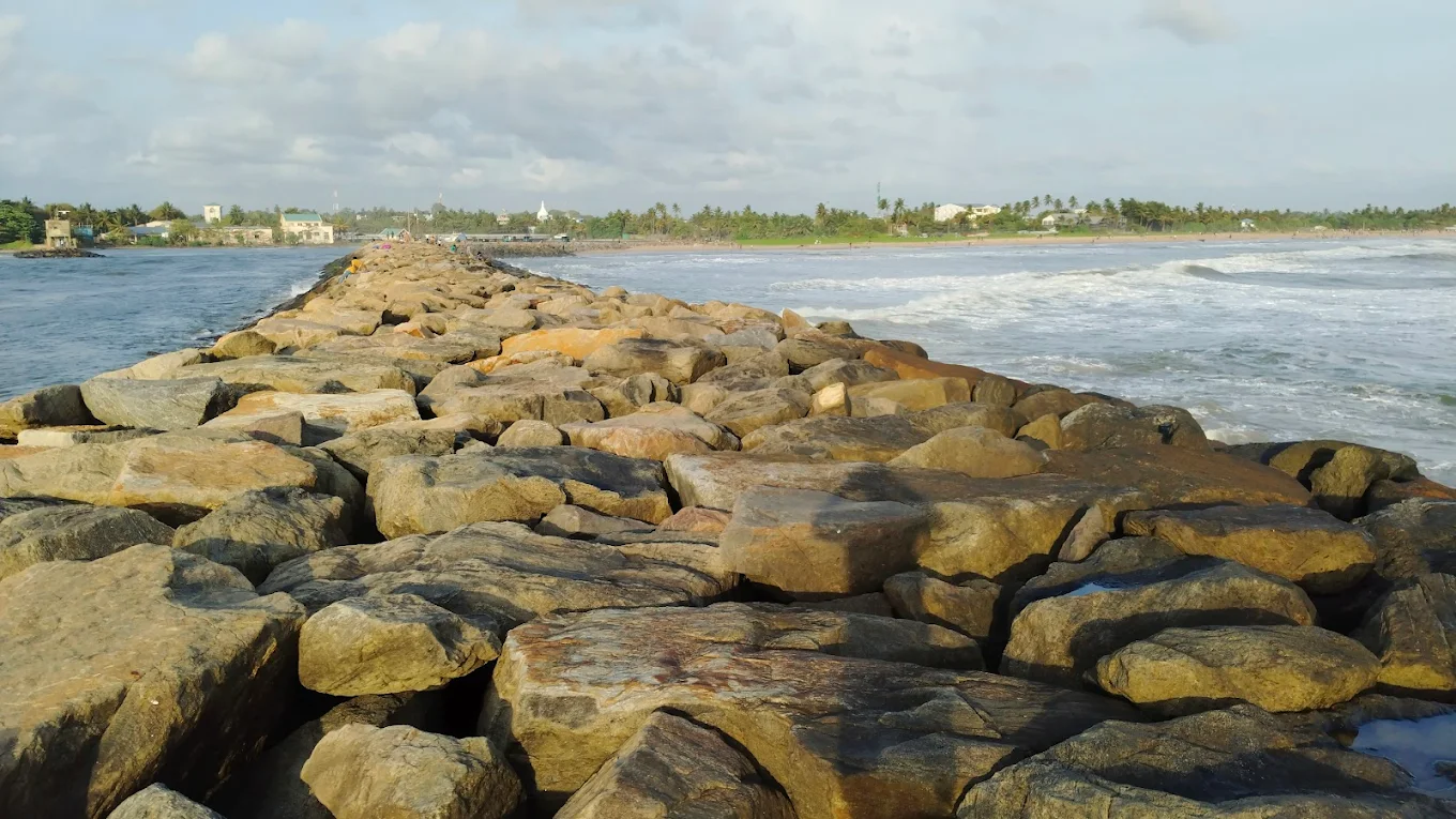 The Panadura Beach Breakwater is a long structure made of large rocks and concrete that stretches into the Indian Ocean. It is located in the town of Panadura, right where the Bolgoda River flows into the sea. This place is famous for its long walking path, where you can feel the sea spray and watch the waves crash against the rocks. It is a favorite spot for locals to relax in the evenings.