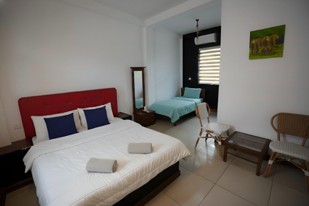 The hotel is located in a very quiet and peaceful environment, away from the trouble, but still with good connection. It is located near rice fields that offer a picturesque view. It is a good base to explore the surroundings of Colombo, offering a garden or pool view. The hotel offers its guests access to two clean and very well-maintained swimming pools as well as free parking. In the evening, the Skybar serves drinks and invites you to end the day. A restaurant may not always be located directly in the hotel, but it is possible to serve food from outside providers (e.g. B. Uber eats) to order. There are also numerous restaurants with local and international cuisine nearby.