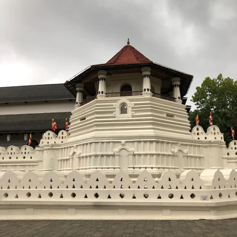 The Sri Dalada Maligawa, also known as the Temple of the Sacred Tooth Relic, is a world-famous Buddhist temple located in the heart of Kandy, Sri Lanka. This beautiful golden-roofed temple is part of the Royal Palace complex and is home to the left canine tooth of the Lord Buddha. Because of its great history and religious value, it is a UNESCO World Heritage site and remains one of the most visited places in the country.